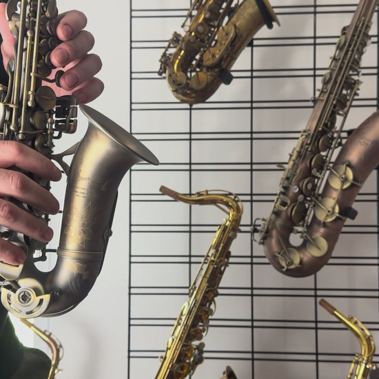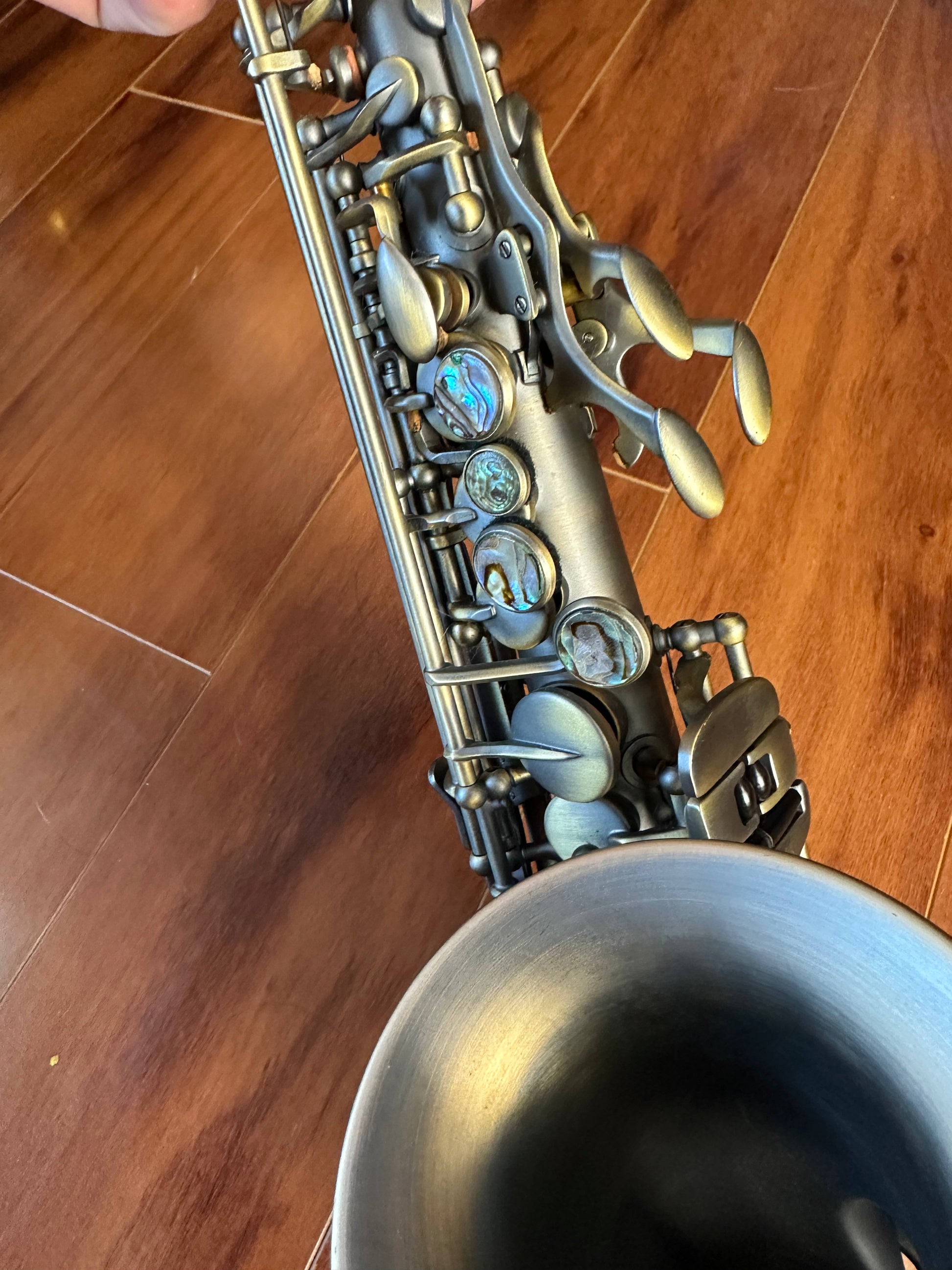 This P. Mauriat curved soprano is not merely a novelty, it is a seriously good soprano! Very comfortable to play, good intonation, and a cute yet professional appearance. It features the dark vintage finish with abalone key tocuhes.