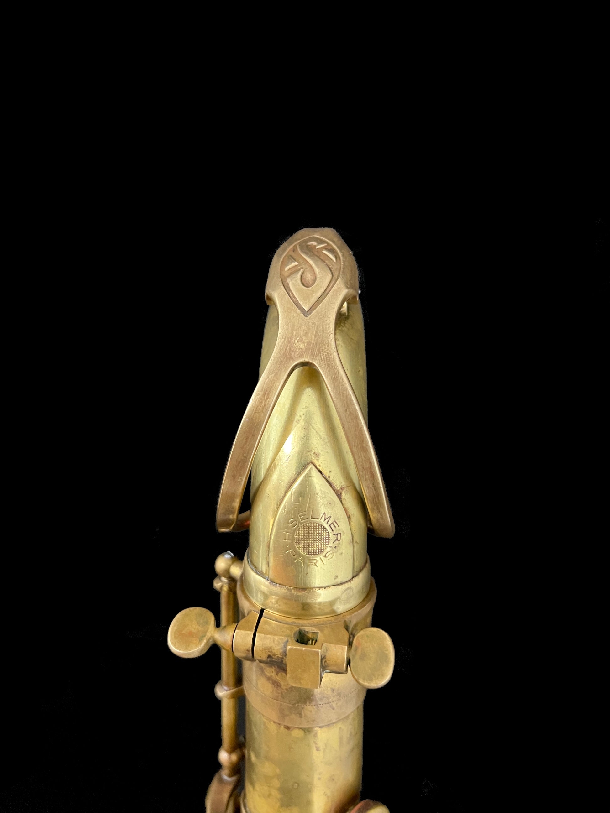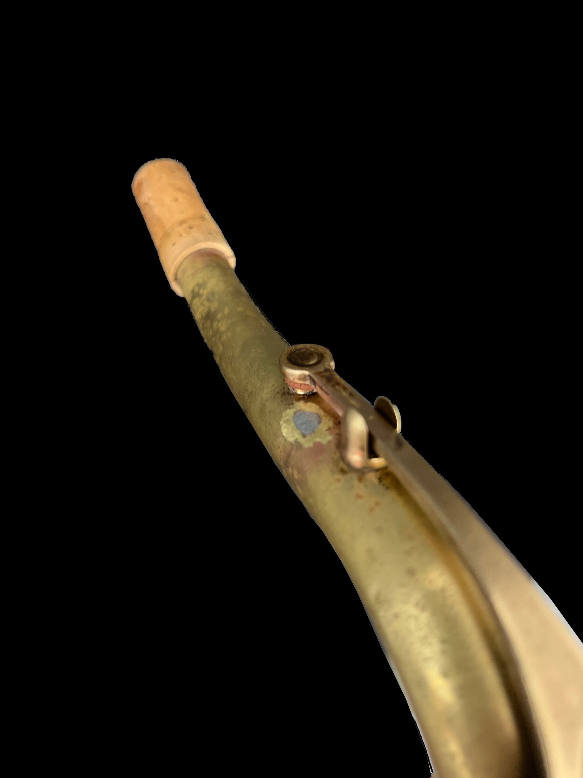 This saxophone lacked most of it's finish when we received it thus, the horn went through the standard process to remove the remaining nitrocellulose lacquer. After completely removed, the horn received a coat of renaissance wax to add a layer of protection which, will help the horn patina in a beautiful and even way that will prove unique to whomever plays this saxophone.